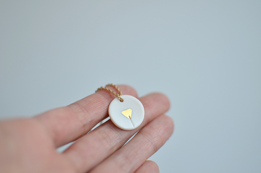 Le pendentif est façonné manuellement dans mon atelier. L'élément en porcelaine est cuit à trois reprises (jusqu'à 1240°), et émaillé pour résister aux salissures.