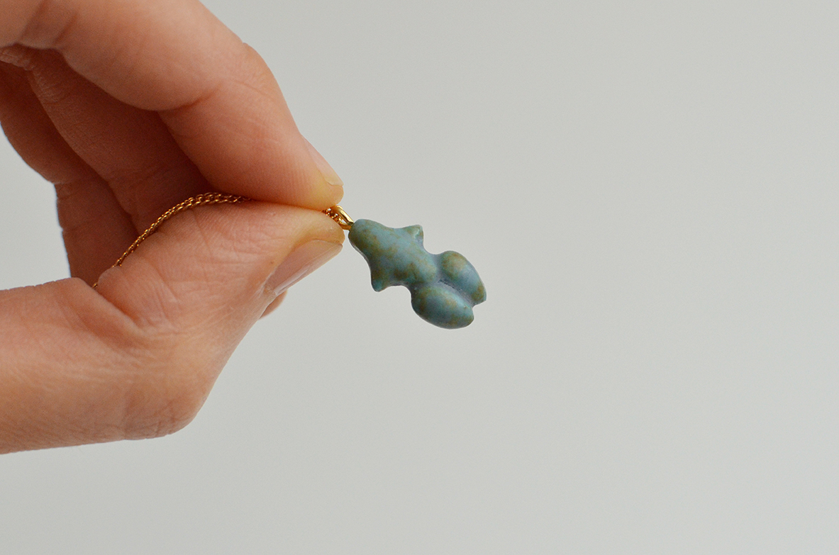 Le pendentif est façonné manuellement dans mon atelier. L'élément en porcelaine est cuit à deux reprises (jusqu'à 1240°), et émaillé pour résister aux salissures.